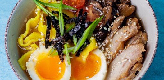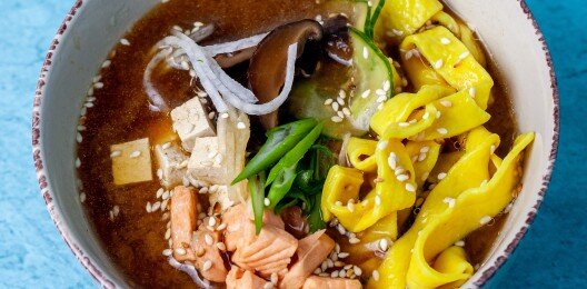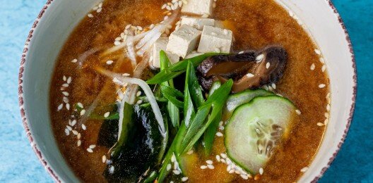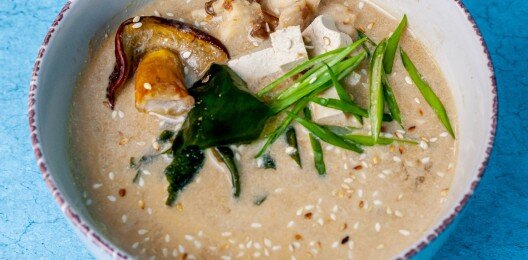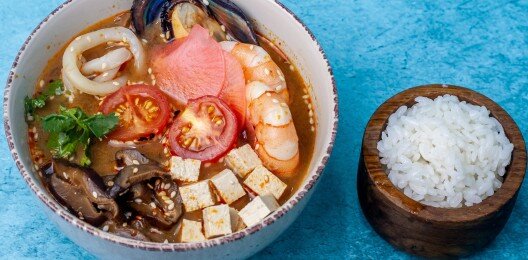 Мисо бульон, кимчи соус, табаджан, яйцо, грибы шиитаке, сыр тофу, водоросли вакаме, огурец, зелёный лук, белый кунжут.