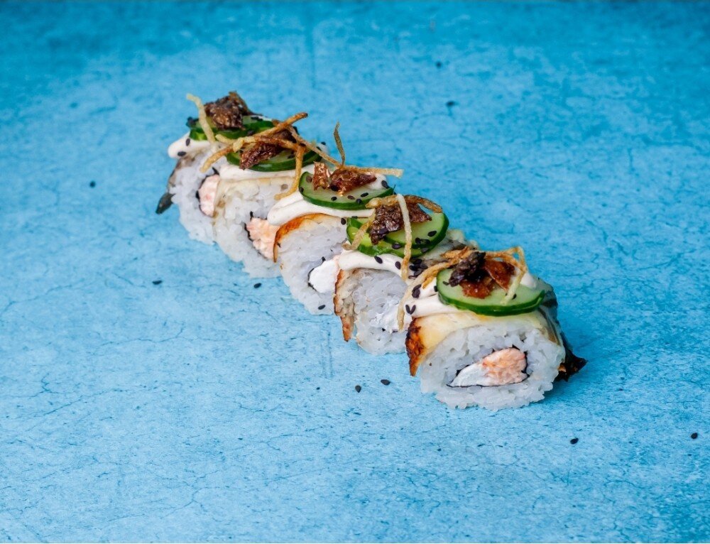 Угорь, творожный сыр, огурец, снежный краб, ореховый крем-соус, кунжут черный, кожа лосося фри, картофель пай, рис Calrose, водоросли нори Gold, 5 шт.
