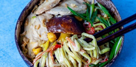 Свинина, лапша удон, болгарский перец, морковь, китайская капуста, репчатый лук, тайский соус, огурец кимчи, жареные бобы, брусника, зелёный лук.