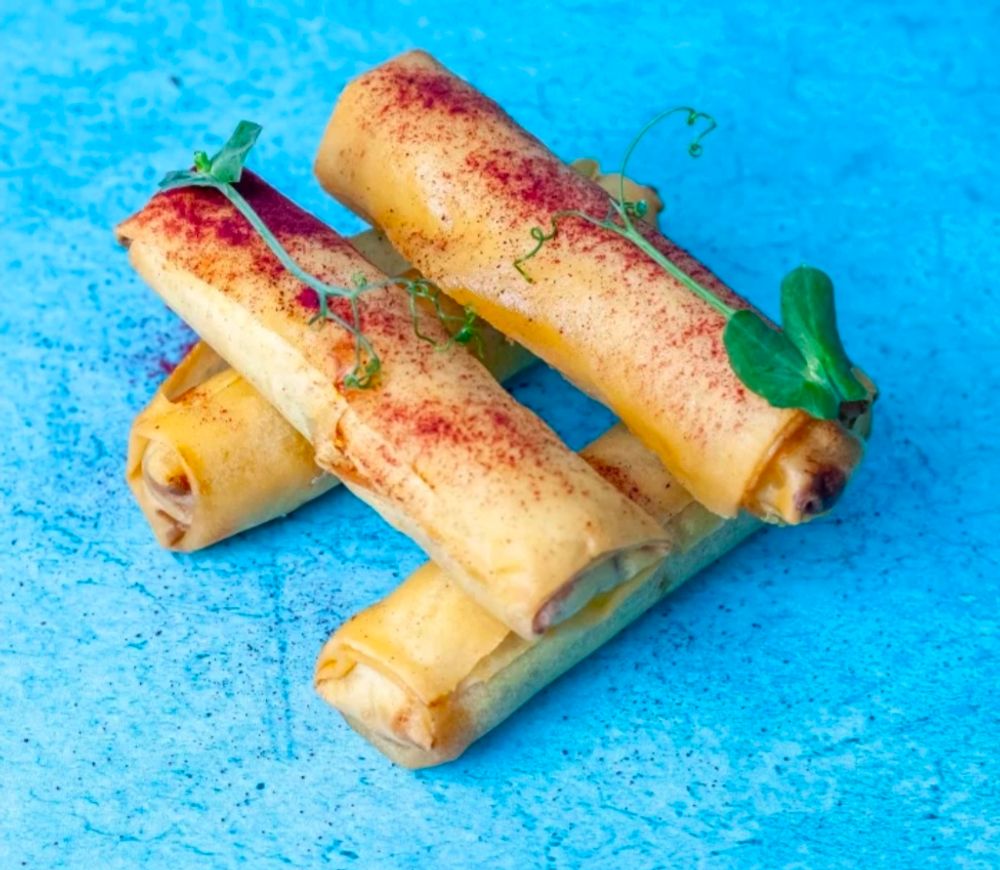Хрустящие рулетики из специального теста для спринг-роллов с белыми грибами, сыром Гауда, морковью, китайской капустой, чесноком, ореховым-крем соусом, соевым соусом, кунжутным маслом, свекольный порошок, микрозелень, 4 шт